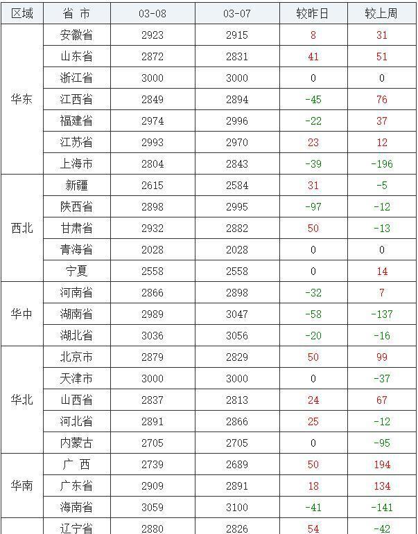 不过话又说回来,3月份玉米行情的利空因素较多,3大坏消息接踵而至,可能会进一步刺激玉米行情显现小幅度下跌的趋势。以3月8日为例,黑龙江、吉林、河南等全国多个省份的玉米平均报价均出现下跌潮,其中陕西跌势最大,跌幅为97元/吨。下图是8日全国玉米价格行情汇总图,为手有余粮急于抛售的农户提供一个参考。