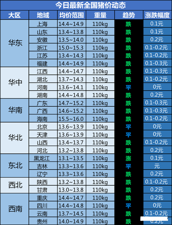 截止到3月11日,毛猪价格仍然保持下跌态势,全国猪均价14.075元/斤,比昨天下跌0.095元。今天猪市除了河南、北京、天津、吉林、四川之外,其余省份全部下跌,下跌幅度在0.1-0.3元不等,目前东北、华北、西北地区均价在13.5元左右,部分地区即将进入12元区间。