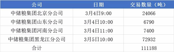 最近时段,中储粮各地分公司轮换玉米接连投放市场。国家粮食交易中心3月8日接连发出5地轮换玉米交易公告,合计总量87953吨,加上9日吉林的44883吨,本周至今已有13.28万吨轮换玉米投放。