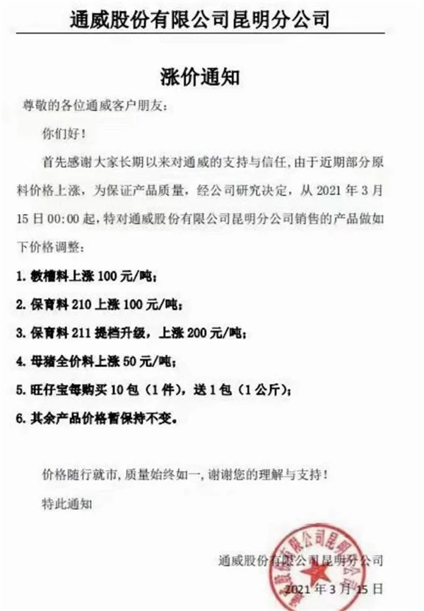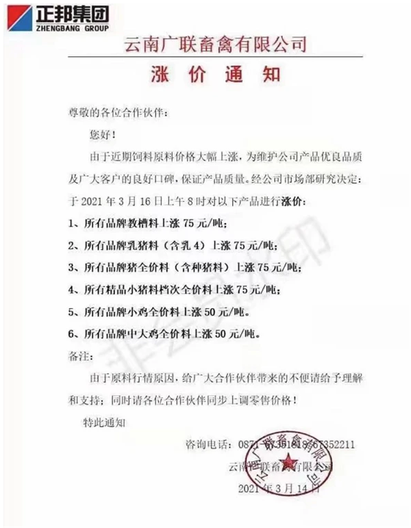 玉米、豆粕价格持续下调,15日豆粕下跌10-20元/吨。尽管如此,原料整体上涨幅度依然使料企难以承担,之前华南一直未涨价的料企开始宣布调价上涨。