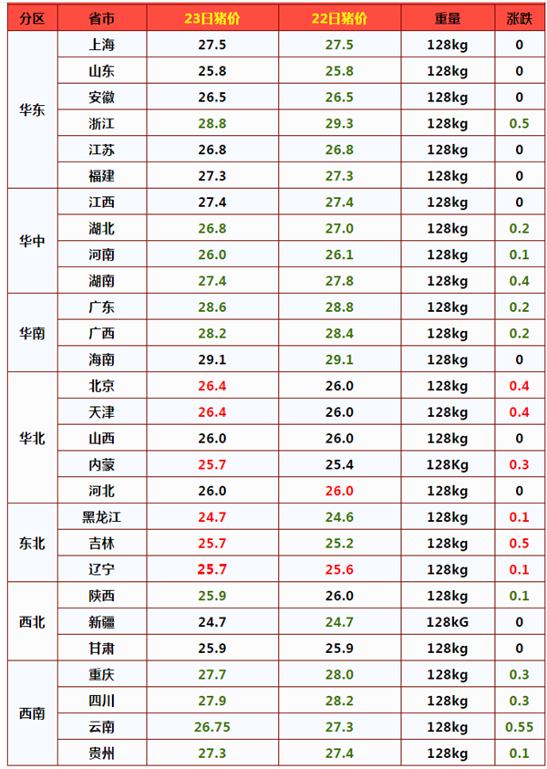 而在高价省市中,华南地区,猪价小幅回落,广东以及广西猪价下跌0.2元,海南猪价企稳,目前,外三元生猪均价跌至28.2~29.1元/公斤。