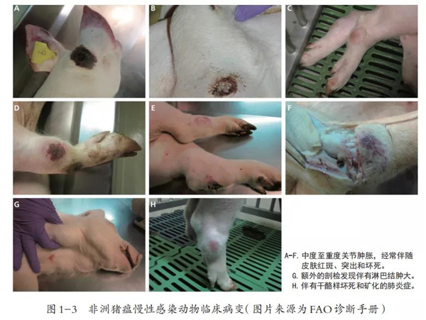 出生的活仔活力较差,能够存活到生长-育肥阶段的猪似乎会排毒感染其他猪只。慢性的非典型非洲猪瘟疾病主要是慢性血管和免疫系统疾病。显微镜下多器官可见带有梗塞和血栓的活跃坏死和出血区,以及慢性纤维化病变,特别是在淋巴结和肾脏上肉眼可见。