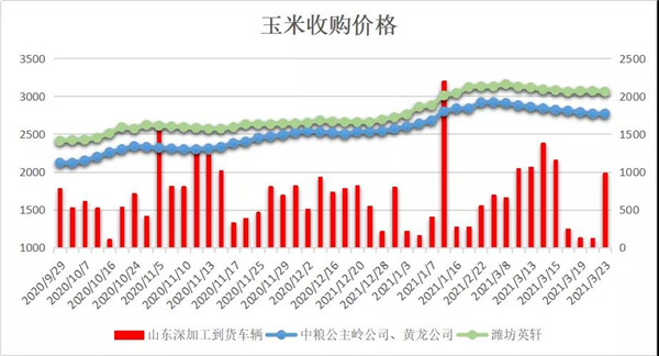 据统计本轮玉米价格下跌已经超过半个月,已经有不少人扛不住压力陆续抛售,期现货下跌幅度基本接近。现货来看,中粮公主岭、黄龙公司23日收购价格2770,较3月初高点已经下跌150元/吨;山东潍坊英轩收购价2970,较3月初高点已经累计下跌100元/吨左右。