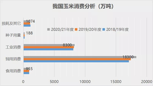 近年来,受益于居民消费水平的提升以及下游饲料和深加工行业快速发展,国内玉米总消费量持续上涨。2020/2021年度饲料行业玉米消费量达到18500万吨,同比增加6.32%;深加工行业玉米消费量在8200万吨,同比稳定。