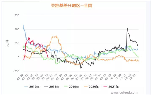 另外,我从上图我们可以看到,后面这段时间历史数据看到,基差都是在走弱的。因为巴西大豆来了嘛!唯一很另类的就是去年数据了,去年3-4月期间,基差有一个大幅上涨的过程。当时主要是因为炒作“巴西受疫情影响,大豆无法装运”,但是,后来事实证明,巴西根本就不管这档子事,照样装船,而拼了命去装,如果从4月中旬开始,基差一路爆跌,因为巴西大豆来了。