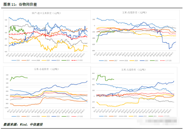 国内玉米现货价格持续走弱,与进口玉米、小麦等谷物的价格不断缩小,但整体仍然满足行业可替代标准,今年全国各地销区有望进一步提高替代比例,进一步打击玉米饲用需求。明显国内玉米与进口玉米、小麦、高粱、大麦的价差分别为34.65元/吨、353.82 元/吨、-187.29元/吨和582.71元/吨。