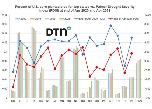 据外媒,2021年5月上半月是美国玉米带30多年来第5冷、第9干的5月上半月,而截至5月9日当周,美国主要玉米产区的播种完成率已达67%,高于去年和五年平均水平,这意味着随着作物进入关键发展阶段,干旱条件或引发更严重的损失。