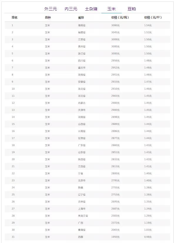 玉米均价(饲料原料)前十:海南省3080元/吨、福建省3045元/吨、江苏省3009元/吨、贵州省3000元/吨、浙江省3000元/吨、四川省2956元/吨、重庆市2952元/吨、湖南省2951元/吨、安徽省2933元/吨、湖北省2910元/吨。