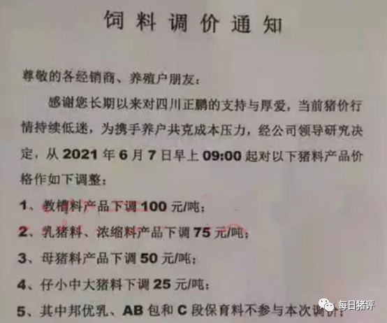 近期新希望六和、成都特驱、重庆双胞胎饲料企业等先后发布饲料降价通知,浓缩料、乳猪料、教槽料、中大猪、母猪等均有不同幅度降价,最大降幅高达100元/吨!部分饲料企业表示,因猪价持续下降,为感谢养户长久以来的支持,携手养户共克成本压力,决定最大力度的让利终端。