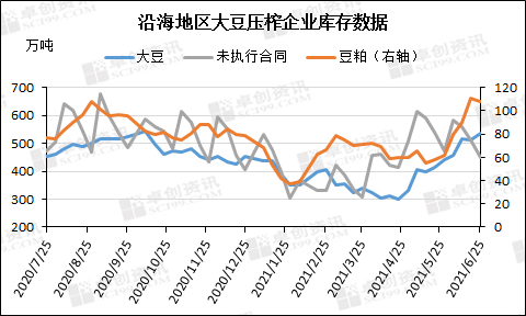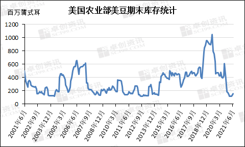 上半年豆粕价格在高位震荡,支撑价格的最大基础,来自全球大豆的低库存现状。根据美国农业部发布的数据显示,2020/21年度全球大豆期末库存仅为8800万吨,这主要来自美国结转库存的历史低位。2020/21年度美豆结转库存仅为366万吨,数值为2011/12年度以来的最低值。而需求端看,中国蛋白市场从猪瘟中逐步恢复,年度进口大豆预估值重回1亿吨,供需方面的相对错位,是支撑上半年行情的最主要原因。
