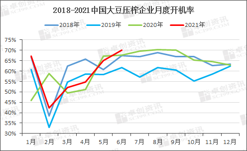 从开机率来看,国内大豆压榨工厂上半年平均开机率58.52%,市场在2-3月为开机率低点月份,2个月平均开机率仅为47%。原因主要在于春节期间的集中停机,以及由于巴西发货缓慢导致的大豆延期到港。后期随着到港节奏的逐步恢复,工厂开机率不断攀升,6月份国内工厂的平均开机率已经升至69.93%。开机率的不断恢复,同样对市场供需节奏产生明显影响。