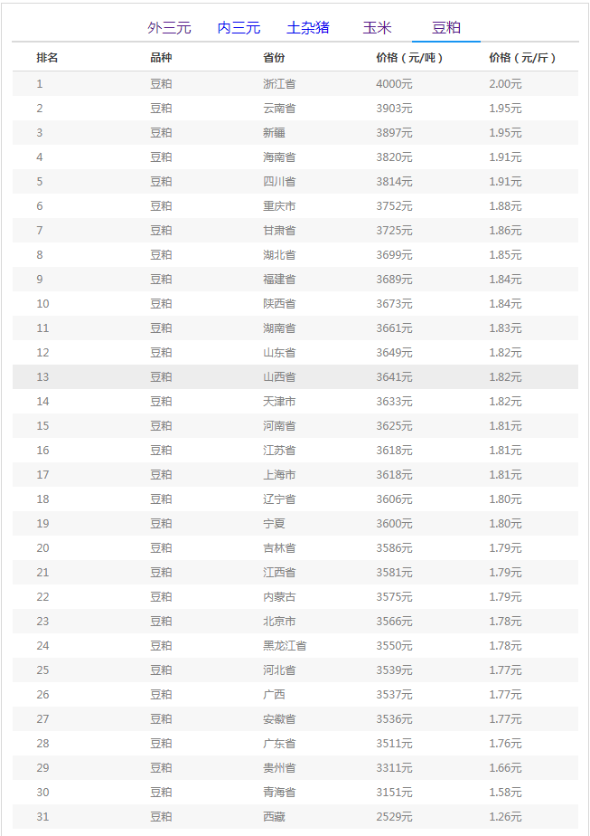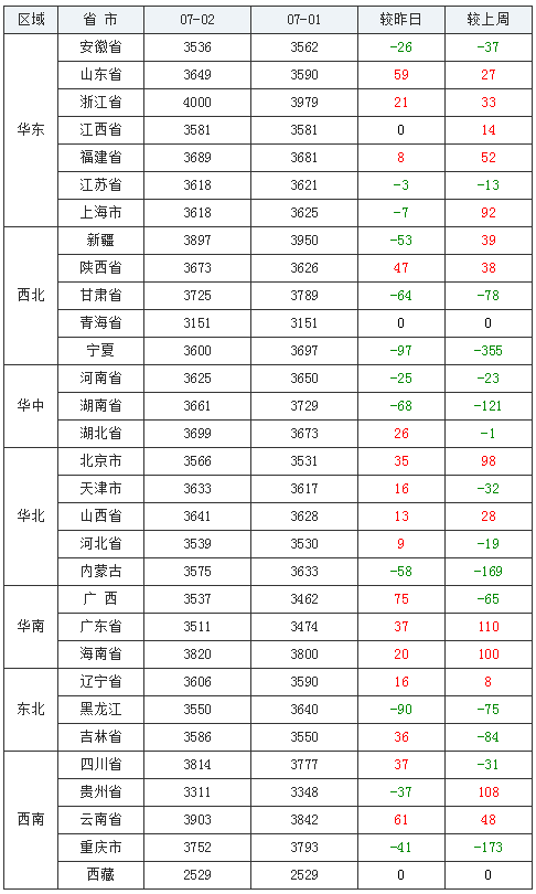 下跌地区(12个):安徽省、江苏省、上海市、新疆维吾尔自治区、甘肃省、宁夏回族自治区、河南省、湖南省、内蒙古自治区、黑龙江省、贵州省、重庆市;跌幅为3-97元/吨。