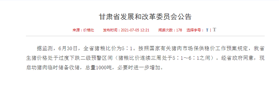7月5日,甘肃省发改委发布公告,据监测6月30日全省猪粮比价为5比1。按照国家有关猪肉市场保供稳价工作预案规定,我省生猪价格处于过度下跌二级预警区间(猪粮比价连续三周处于5比1-6比1之间)。经省政府同意,现启动猪肉临时储备收储,总量1000吨,必要时进一步增加。