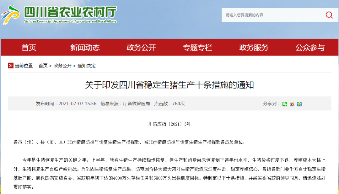 7月6日,四川省非洲猪瘟防控与恢复生猪生产指挥部印发《四川省稳定生猪生产十条措施》,提出各级各部门要千方百计稳定生猪生产和价格,加强政策支持,稳定养殖信心,确保全年完成4000万头存栏任务和5800万头出栏调度目标。同时也提到,要进一步做好猪肉收储准备、加快构建猪肉常态化收储投放机制。