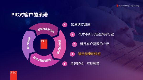 有行业的朋友说,在中国不需要进行遗传改良。获得遗传的进步太难了,而因为疾病多,一点疾病就把遗传的进步吞噬了。这说出了一个事实,就是疾病是最大的X因素。在健康方面和遗传改良方面来说,你想中国养猪业永远这样么?明天呢?你不努力,就没有明天。你努力,就有搞好的希望。国内少数一些大企业把年断奶头数做到26头,28头,这些都是努力的结果,不是白来的。巴西能做到32 头,那儿的疾病少是一个不争的事实,遗传潜力能得到充分的呈现。我们的差距还是不小!所以,生物安全,要搞,狠狠的改进,落实,再改进。 俄罗斯不也从非洲猪瘟疫情下恢复了生产么? 图1 PIC对客户的承诺 |