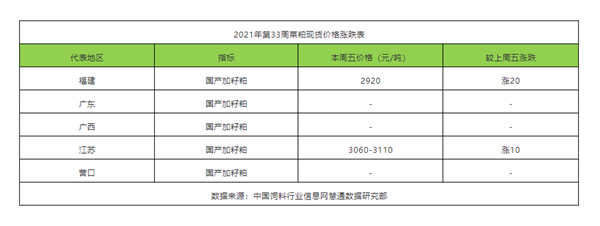 本周国内菜粕震荡偏强。期货方面,本周郑州菜粕期货震荡偏强。周一郑粕高开后震荡走强,收涨至3010元,大涨63元;周二郑粕高开后继续走强,收盘价3029元,大涨51元;周三郑粕高开后走弱,收跌至3016元,下跌6元;周四郑粕低开后继续走弱,收跌至2934元,大跌78元;周五郑粕低开后震荡偏弱,截止笔者收稿,最新2967元/吨,无涨跌。现货市场,近期美豆震荡调整以等待USDA月报公布,而USDA月报数据较市场预期中性偏多,报告公布后美豆价格冲高后回落,对国内粕类支撑性不大。而今年水产养殖利润较高,养殖户投苗积极性较强,且随着水产养殖旺季的到来,菜粕需求进一步增长,且因疫情担忧影响物流受限,下游贸易商采购活跃,菜粕库存快要被提货完毕,对菜粕形成支撑,叠加临池豆粕库存减少,和市场预期8月大豆到港量下滑,同时,国家发布了新的检疫政策,要求所有船只到港后要停14天后才能卸船,市场对蛋白粕挺价心理加强,不过经过前几日的成交放量后,油厂出货速度放缓,需求转淡,叠加油脂强劲上涨,压制国内粕类,也令市场追涨情绪降温,预计短期内菜粕将跟随豆粕震荡调整为主。后续仍需密切关注美豆和豆粕行情走势。