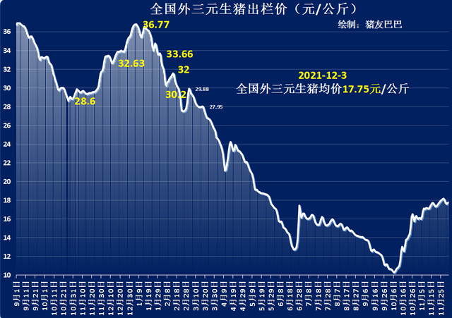 而随着猪肉价格的探底,在猪肉收储以及市场腌腊利好提前的加持下,受市场肥猪出栏殆尽,生猪供给持续紧张,国内生猪价格迎来了阶段性的回调周期,目前,行情波动上涨的态势仍在持续,其中,11月下旬国内标猪价格一度涨至18.15元/公斤,虽然受下游消费掣肘,猪价有回调的表现,可是进入12月初猪价再次止跌走强,12月3日,全国标猪价格徘徊在17.75元/公斤!