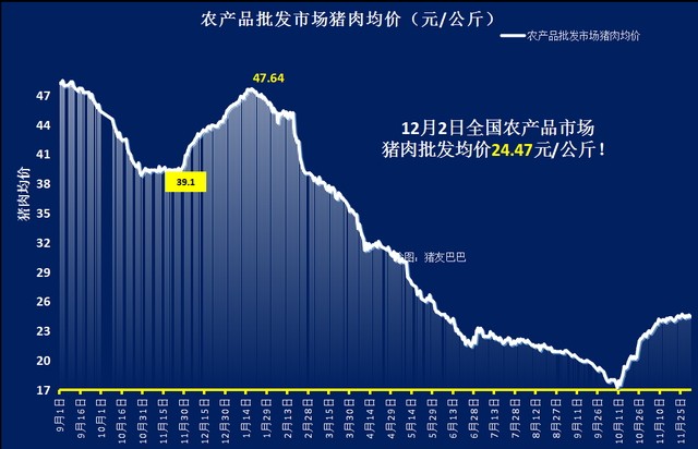 据猪价系统分析,目前标猪价格相比10月初,短短2个月的时间,生猪价格涨幅高达72.5%!当然,受猪价的大幅走强,国内猪肉价格也明显提振,从农业农村部数据中心了解,12月2日,国内批发市场猪肉批发均价24.47元/公斤,相比10月中旬17.23元,猪肉价格上涨了42.02%!