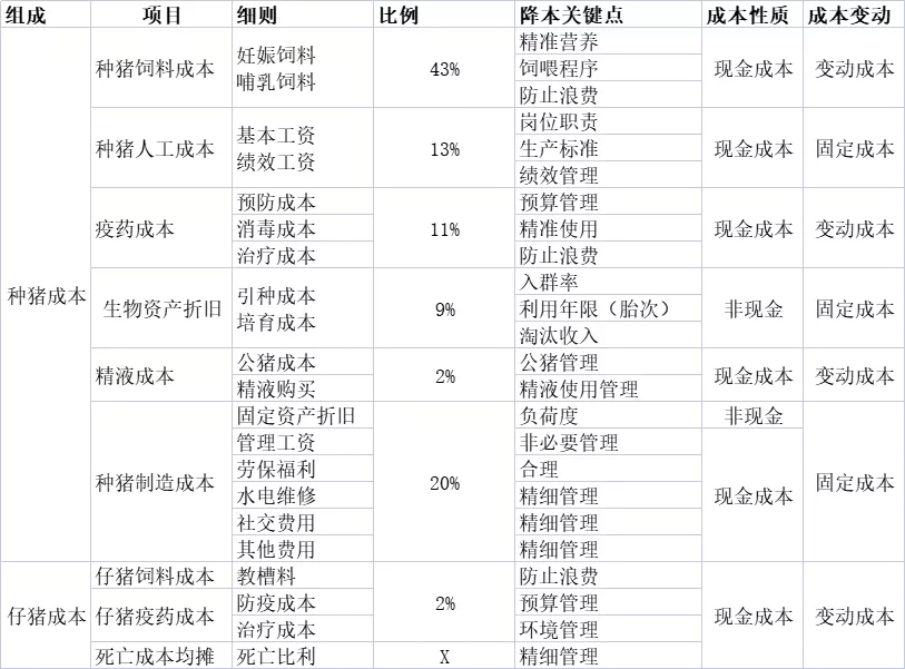 其中,种猪成本又分为饲料成本、人工成本、疫药成本、生物资产折旧成本、精液成本和种猪制造成本;