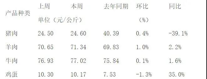 本周重点监测的畜禽产品猪肉、羊肉、牛肉、鸡蛋和白条鸡与上周相比,变化幅度在-1.3~1.4%之间。