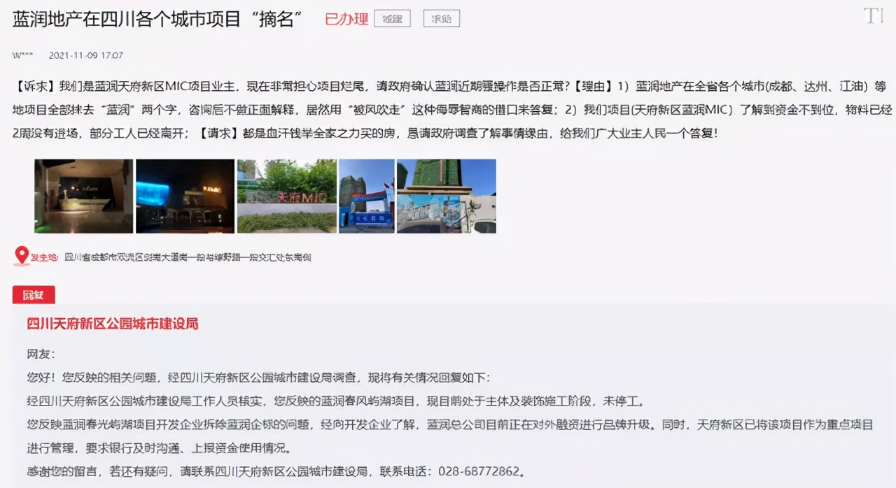巧合的是,近日有网友通过人民网领导留言板反映,蓝润地产在四川成都、达州、江油各个城市的项目“摘名”,现在非常担心项目烂尾。其中,被去掉“蓝润”两个字的就包括“蓝润天府MIC”。