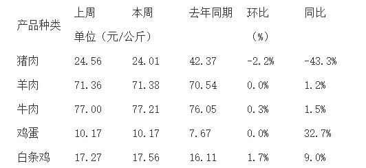 本周重点监测的畜禽产品猪肉、羊肉、牛肉、鸡蛋和白条鸡与上周相比,变化幅度在-2.2~1.7%之间。