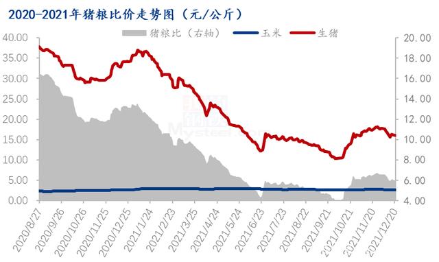 11月份随猪价强势运行,国内猪粮比值猪价脱离过渡下跌三级预警状态,养殖端利润扭亏为盈。但进入12月份,南方腌腊灌肠活动逐渐消退,国内新冠疫情再起,终端消费有待提振,猪量比价难有利好支撑,截至20日再度回落至5.98,徘徊于过度下跌预警边缘。玉米价格近期虽偏弱调整,但市场波动极为有限,对未来养殖端盈利亦难形成明显利好。