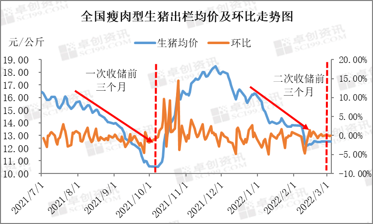 带动两次收储的仍旧是猪粮比的预警。通过国家监测数据显示,2月21日-25日,全国猪粮比价为4.98:1,进入过渡下跌的一级预警区间,随后国家发布于3月3日及4日进行两轮猪肉收储。从猪价走势上看,据卓创资讯监测数据显示,截至3月4日,全国瘦肉型生猪出栏均价跌至12.52元/公斤,较2月7日下滑9.14%。