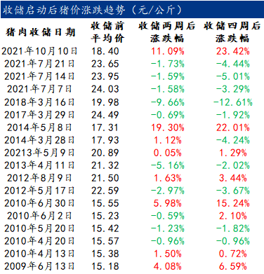 回顾历年部分收储前后猪价涨跌情况,可以发现,除却2021年10月10日收储后,猪价出现较大涨幅之外,2017-2021年多数收储均未使得行情出现较大幅度反转。