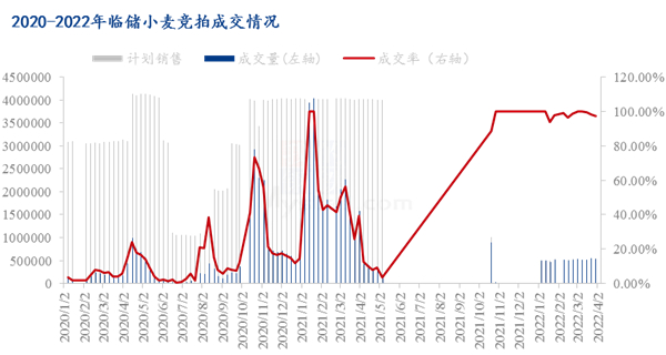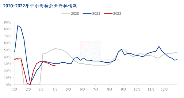 造成此次小麦价格下跌的原因小编认为有以下几点。一方面近期各地区中储粮拍卖接连出现流拍现象,成交率也较之前有所下降,在20%-80%之间。拖市小麦竞拍虽然还是呈现高成交高溢价,但近期成交均价也是不断下跌。3月30日拖市小麦成交均价为2857元/吨,较23日拍卖下跌27元/吨,跌幅0.94%。这也从侧面可以看出当前市场购销逐步趋于理性。另外制粉企业开机较往年同期相比更加低迷,中小型企业开机只有27%,同比下降3%,企业开机较差,消耗小麦库存缓慢,高价收购原粮意愿不强,收购价格窄幅下调。