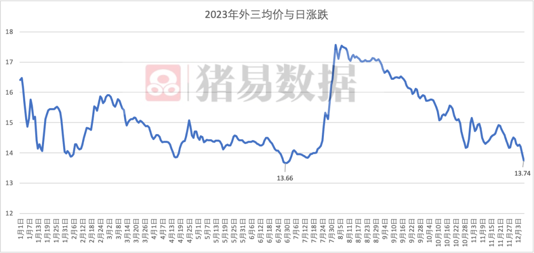 可以看出,2023年6月底外三均价13.66元为今年的最低点,今天的价格距离新低只有一步之遥。明天预计继续下调2毛左右,明日或打破前低。