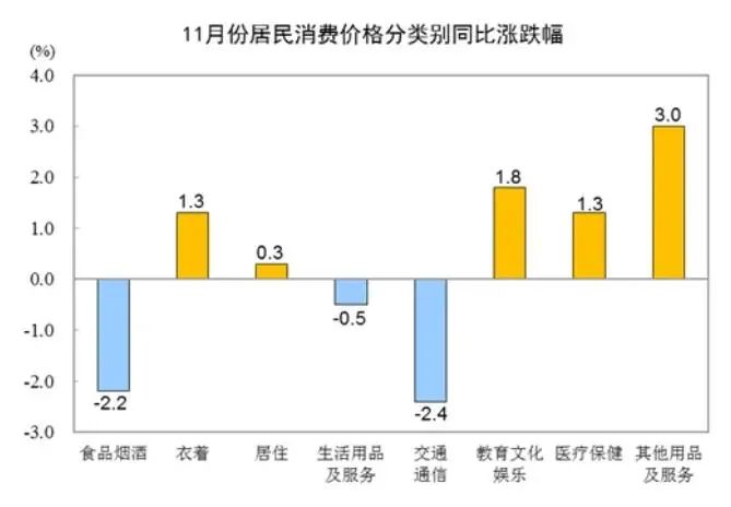 据测算,在11月份0.5%的CPI同比降幅中,翘尾影响约为0,上月为-0.2个百分点;今年价格变动的新影响约为-0.5个百分点,上月为0。