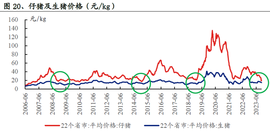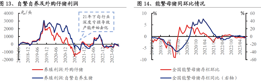 2023.09的母猪存栏水平(4240万头)和2022.06、2021.11末的存栏水平较为接近,相当于正常保有量(4100万头)的103%,该存栏水平下的供给仍大于需求。中远期看,在当前产能对应的产量下行业仍将普遍亏损。