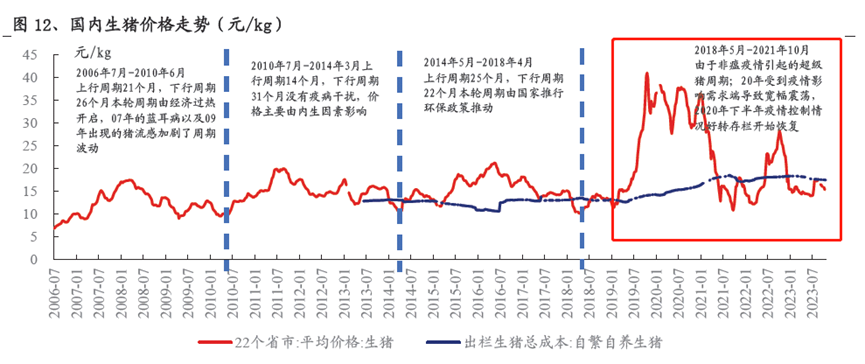 2006年以来,我国猪价共经历了四轮周期,相较于前几轮周期的蓝耳病、仔猪腹泻、环保政策以及非洲猪瘟的外因。