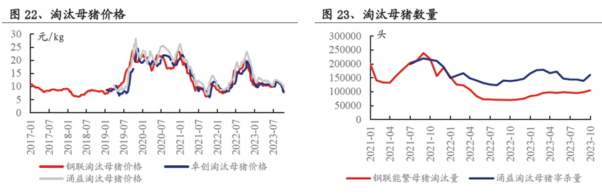 当前淘汰母猪价格跌至历史低位,同时10月淘汰母猪数量有所增加,说明养殖户当前亏损严重,对后市行情悲观,短期加快了母猪淘汰量。