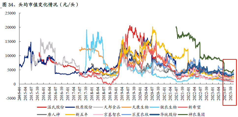 2024年上市公司养殖成本仍有进一步下降空间。估值角度,经过2023年板块持续调整,大部分养殖企业头均市值已位于10%历史分位数以内,在当前位置布局养猪板块具有较高的安全边际。