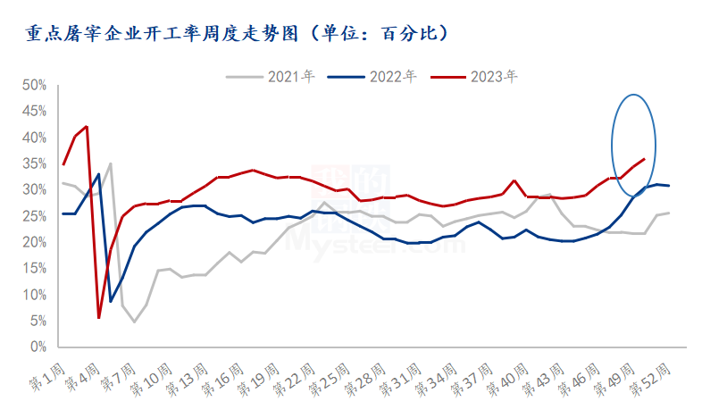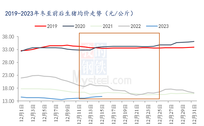 其次,从历年情况看,2019年至今,进入12月份,样本企业周度屠宰开工率整体呈上涨态势,但持续时间较短,并非一直增长。并且受天气、价格高低、周边大环境等影响因素较大。