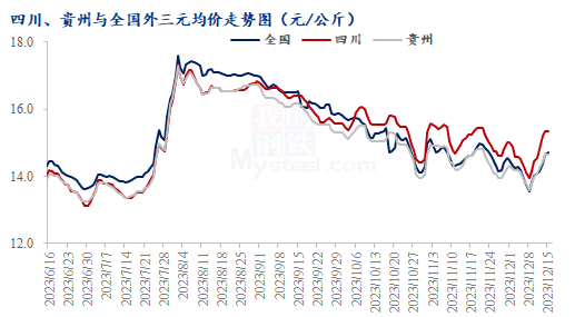 从全国外三元生猪出栏均价来看,西南“高价区”逐渐形成。受大范围降温雨雪天气影响,尤其北方,山东、河南、河北、东北局地高速封路,交通受阻,影响养殖端出栏和调运。短期供应减少,前几日猪价开启持续上涨模式,西南区域同步跟涨,且13日更是“领涨”,均价最高,达到15.45元/公斤。趋势来看,优势不乏继续扩大。