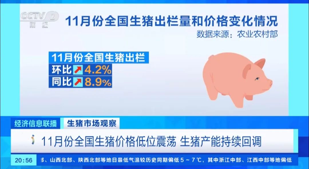 此外,据央视财经25日报道,11月份,全国生猪出栏环比增长4.2%、同比增长8.9%。
