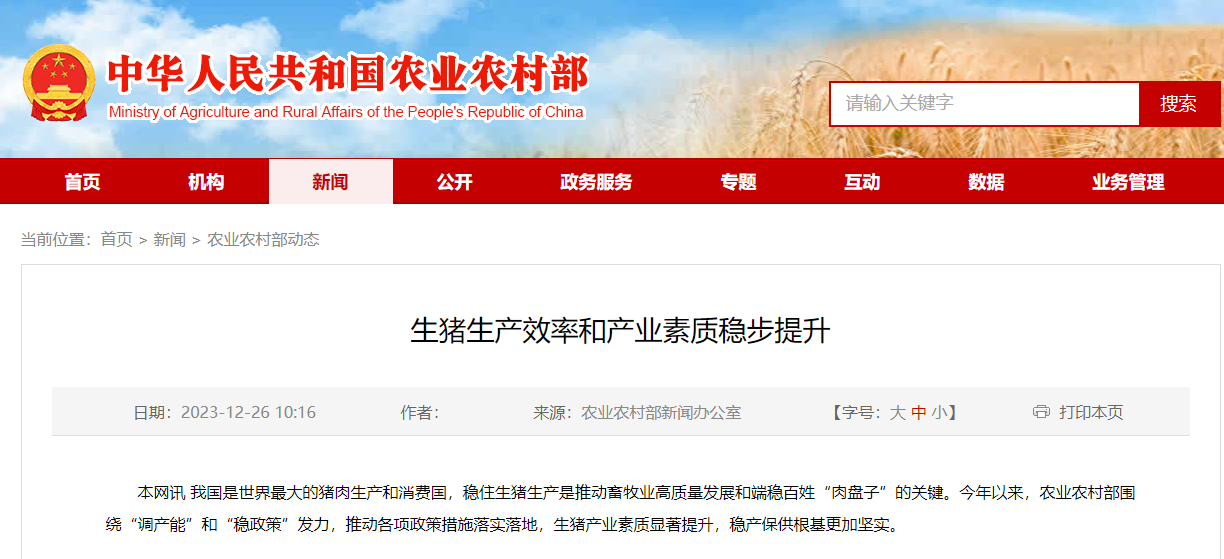 12月26日,据农业农村部官网消息,今年全年生猪生产稳定发展,猪肉市场供应充足。预计生猪规模化养殖比重达到68%左右,比上年提高约3个百分点,生猪生产效率和产业素质稳步提升。下一步,农业农村部将优化完善《生猪产能调控实施方案》,推动生猪产能稳定在合理水平。