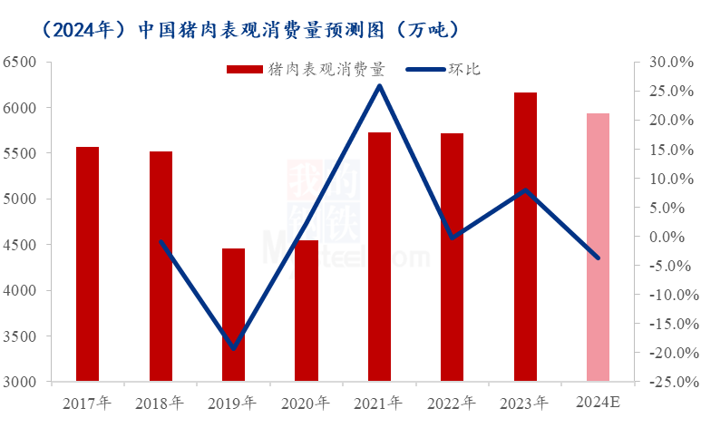 综合来看,猪肉表观消费量主要是受到产能波动影响,预计2024年表观消费量为5932万吨,同比跌幅3.81%。除去表观消费量降低,实际真正消费量在2024年难有明显改善,居民消费习惯及消费能力均有所改变,对猪肉消费逐步减少,因此表观消费量下滑是正常趋势。
