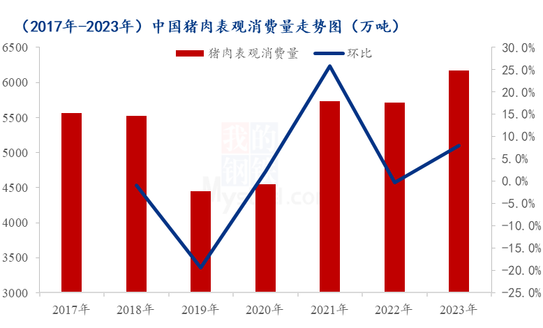 受国内猪肉产量变化及猪肉净进口增减影响,2017-2023年国内猪肉表观消费量整体呈现先跌后上涨趋势。