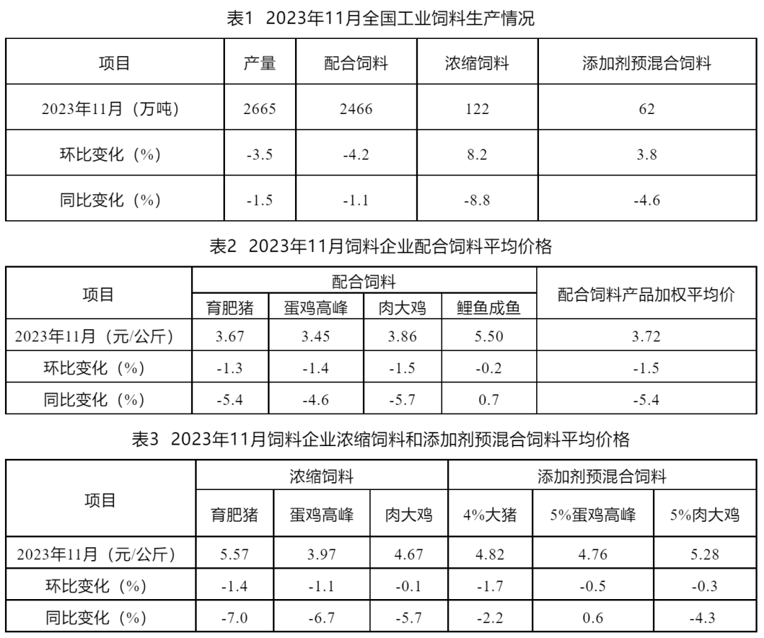 据样本企业数据测算,2023年11月,全国工业饲料产量2665万吨,环比下降3.5%,同比下降1.5%。主要配合饲料、浓缩饲料、添加剂预混合饲料产品出厂价格环比、同比均呈下降趋势。饲料企业生产的配合饲料中,玉米用量占比为31.3%,配合饲料和浓缩饲料中,豆粕用量占比为12.2%,同比分别下降5.0和1.9个百分点。
