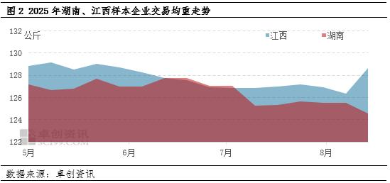 从供应端来看,卓创资讯监测湖南省16家样本养殖企业8月份出栏计划环比增加9.74%,江西省12家样本养殖企业8月份出栏计划环比增加3.83%。月内从两省养殖端出栏节奏分析,截至8月18日,多数养殖企业出栏计划完成50%-55%,完成进度偏慢。由此来看,月下旬两省供应端仍有一定增量预期,养猪端或面临出栏压力,对生猪价格或仍呈现利空影响。
