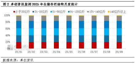 具体来看,生猪体重结构的分化是肥标差走阔的根本原因。据卓创资讯统计,截止到2025年9月末,140公斤以上大猪存栏占比仅1.04%,创近五年同期最低;而90-140公斤标猪存栏占比达37.34%,环比持续提升。养殖端因产能逐步释放以及被动控制生猪出栏体重,导致养殖端出栏积极较高,目前标猪供应端整体充沛,而大猪产能不足,供需失衡直接拉开价格差距。
