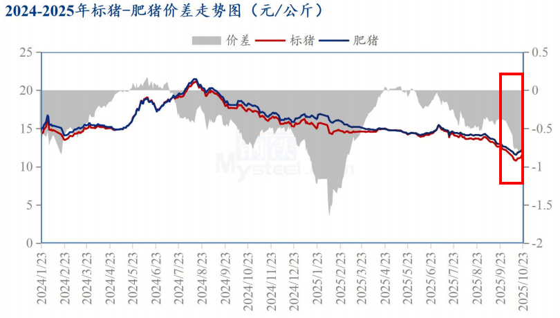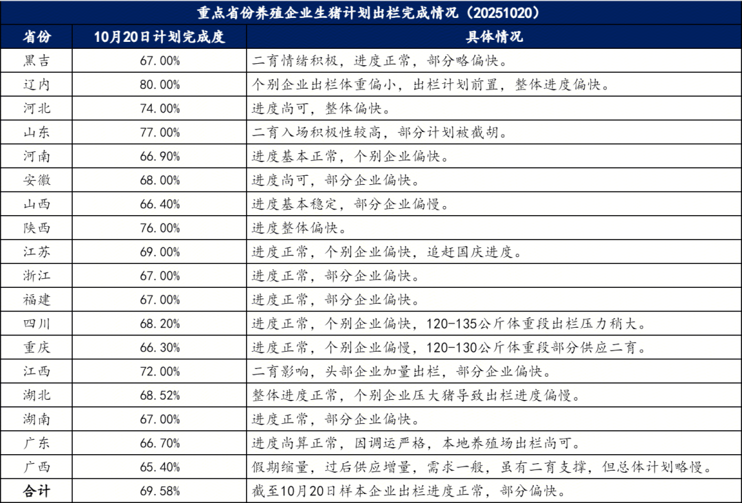 季节性需求拉动:气温下降带动大猪消费需求增加,350斤以上大猪同比供应减少,价格优势进一步凸显,标肥价差出现走扩迹象。二育集中入场支撑:前期猪价跌至低位(中旬全国一度低于5.5元/斤,广西跌破5元/斤),叠加成本优势与行情向好预期,二次育肥积极性显著提升,北方东北三省、山东等地贸易商入场热情高涨。供需两端博弈助推:屠宰企业宰量同步增加,与二育主体形成“竞相拿猪”态势;同时,散户预期增强,部分由“认卖”转为“惜售”,叠加规模场出栏进度基本正常(173家样本企业截至10月20日出栏进度69.58%,超理论正常值66.7%),供应端压力阶段性缓解。
