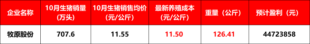 以牧原为例,行业人士“一凡帝诺维奇”在其最近发表的文章中提到,牧原成本为11.5元/公斤,而10月牧原商品猪销量707.6万头,均价11.55元/公斤,若按均重126.41公斤计算,企业可盈利近4500万元。