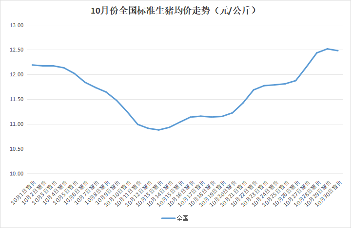 截至11月6日,全国标准体重生猪平均价格为11.84元/公斤,此轮已经连续7天下跌。回顾10月行情,猪价持续探底,个别省份的生猪价格更直逼10元/公斤。进入月底,受二次育肥入场带动,部分企业放缓出栏节奏,猪价一度强势反弹,然而由于需求始终无法跟上,反弹未能持续。又因前期猪价下滑幅度较大,故而全月均价仍呈下跌趋势。