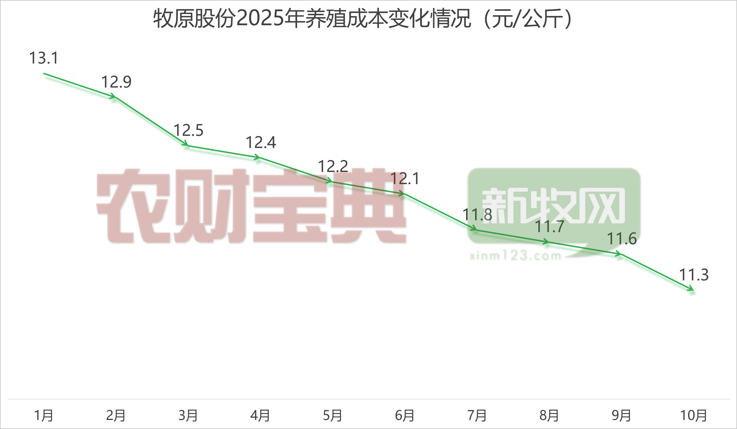 据新牧网统计,牧原股份今年的养殖成本实现逐月下降。从年初的13.1元/公斤已经降至10月份的11.3元/公斤,整整下调了1.8元/公斤。按照一头猪出栏均重120公斤计算,相当于一头猪能多赚216元。对于出栏量庞大的牧原股份而言,这无疑为其节约了一笔巨大的开销。