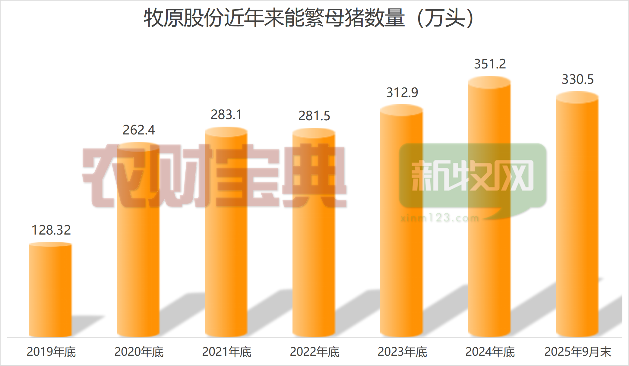 农财宝典新牧网记者统计历年来牧原股份的能繁母猪情况发现,牧原股份2019-2024年的能繁母猪整体呈现增长趋势,今年则出现微降。截至三季度末,牧原股份能繁母猪已降至330.5万头,距离330万头的目标仅剩下5000头的距离。
